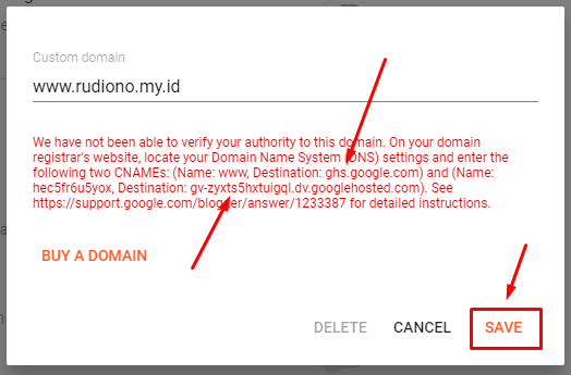- Isi kolom dengan nama domain anda. Misal nama domain anda rudiono.my.id , maka cara mengisinya www.rudiono.my.id kemudian klik “Save” .
